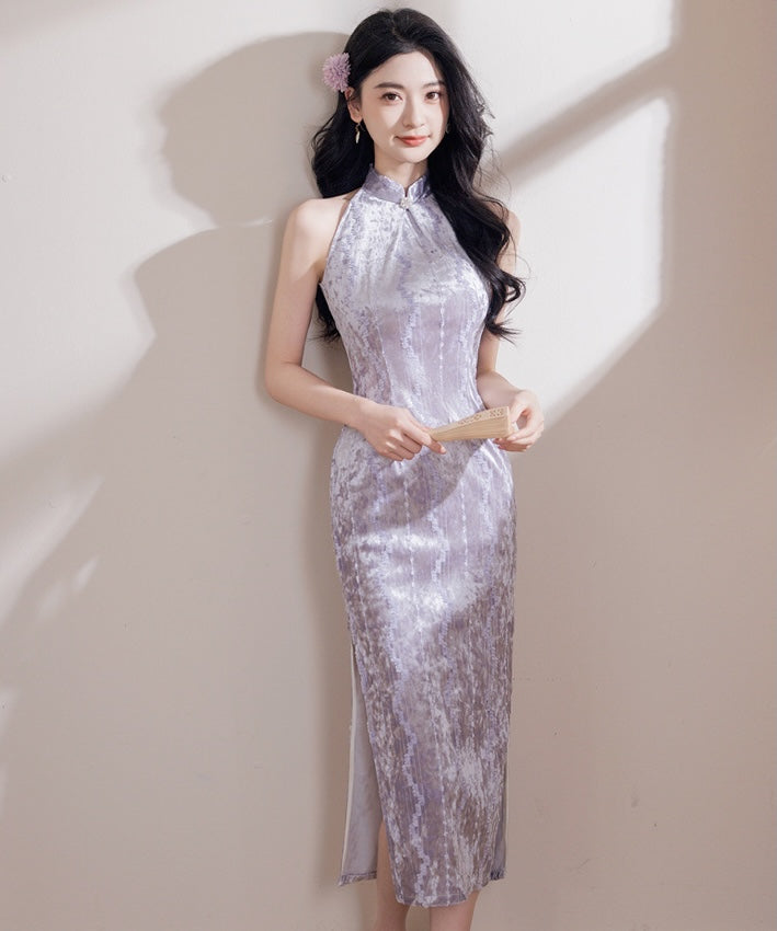 Crafted in a soft, light-catching velvet with a gentle lilac hue,  Elira Velvet exudes quiet elegance with a modern touch. The halter neckline frames the shoulders gracefully, while the sleek silhouette enhances the figure with effortless fluidity. Subtle in tone yet rich in texture, it is a piece that embodies refined femininity and understated luxury.