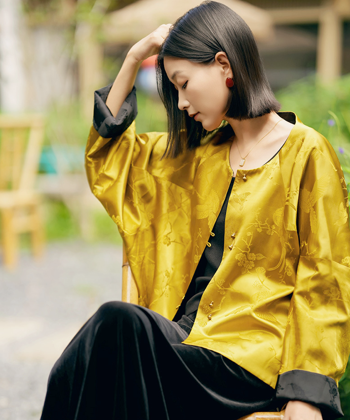A luxurious silk–polyester blend top with a subtle jacquard sheen and fluid drape. Lightweight yet structured, it features elegant knot detailing for a refined, effortless look.