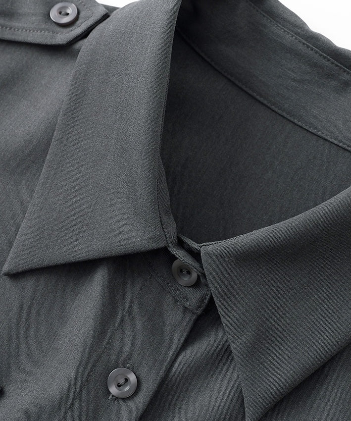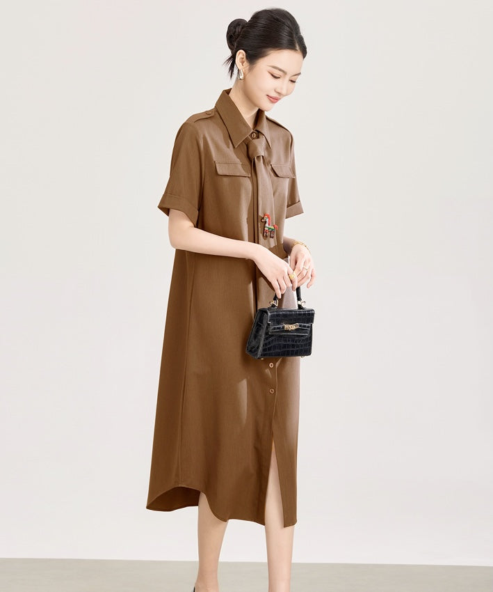 A tailored shirt dress with clean lines and a softly structured silhouette, elevated by a delicate embroidered horse motif. Finished with a waist tie for definition, it blends modern polish with a subtle artistic touch.